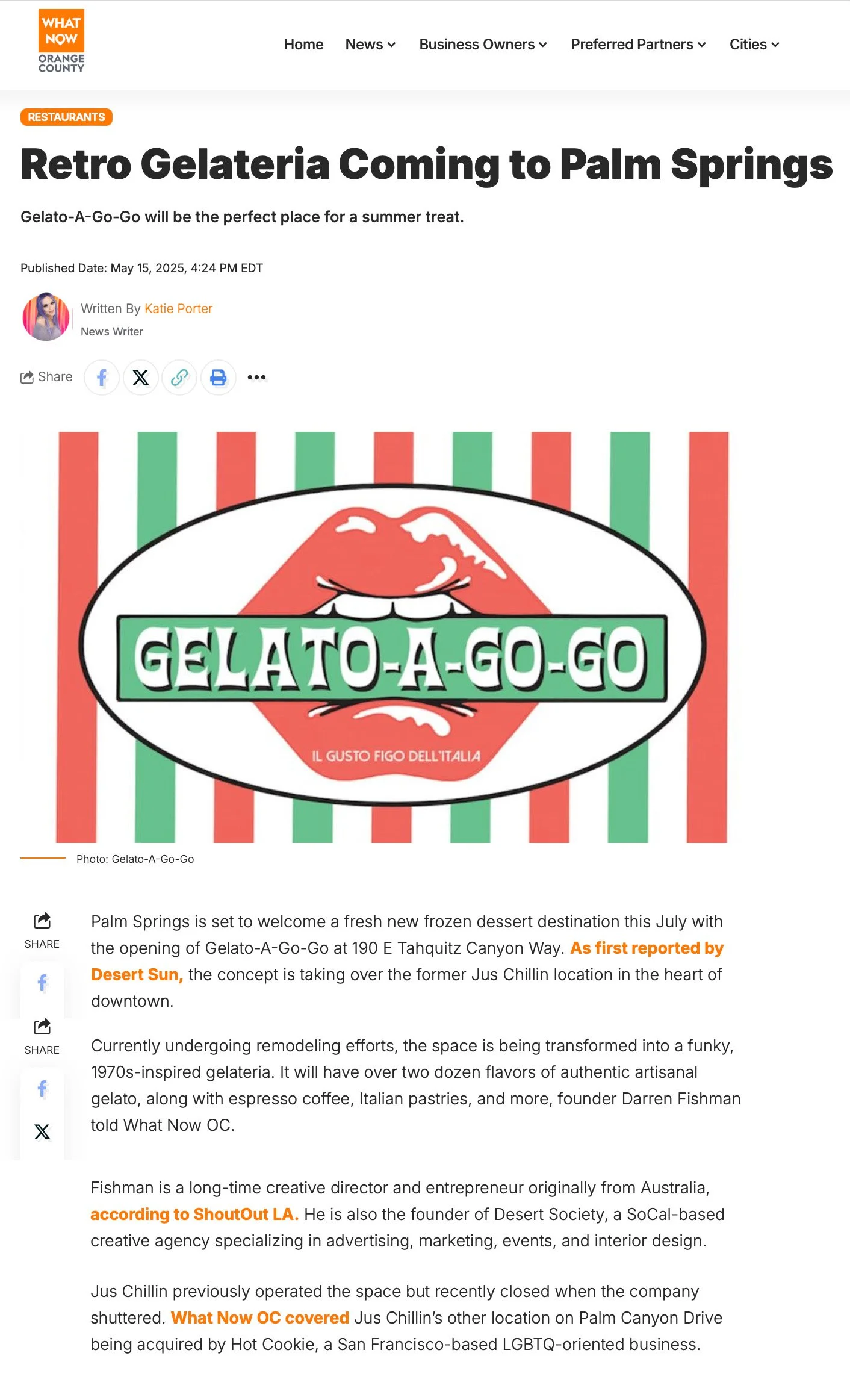I Media Gelato-A-Go-Go in the media People love talking about us! Check out the media exposure we’ve received below… Desert SunMay 6, 2025 What NowMay 15, 2025 Desert SunAugust 21, 2025 Palm Springs TribuneAugust 25, 2025 Palm Springs GuysSeptember 4, 2025 Squad MagazineSeptember 10, 2025 Palm Springs High SchoolSeptember 17, 2025 The MuseOctober 8, 2025