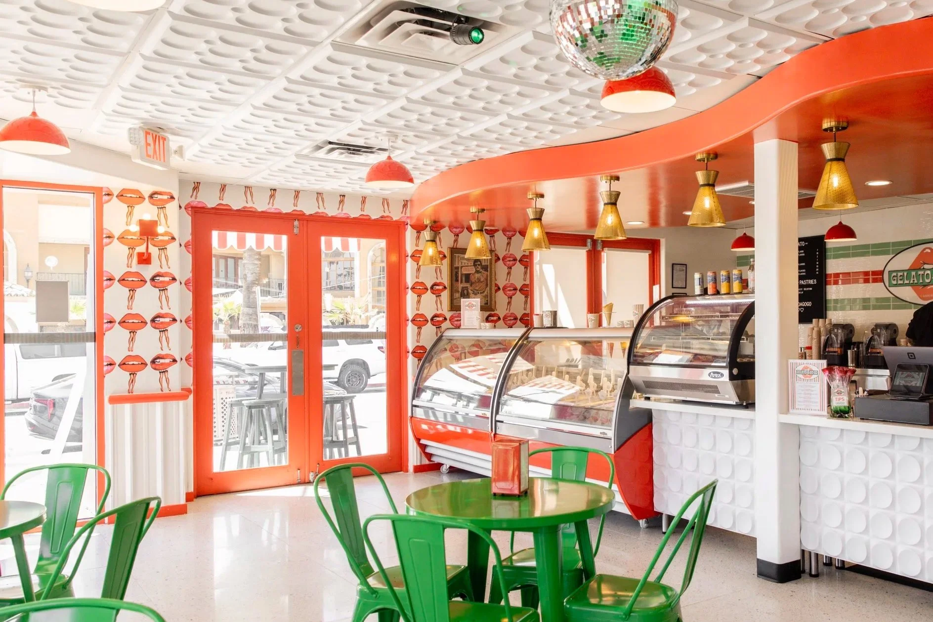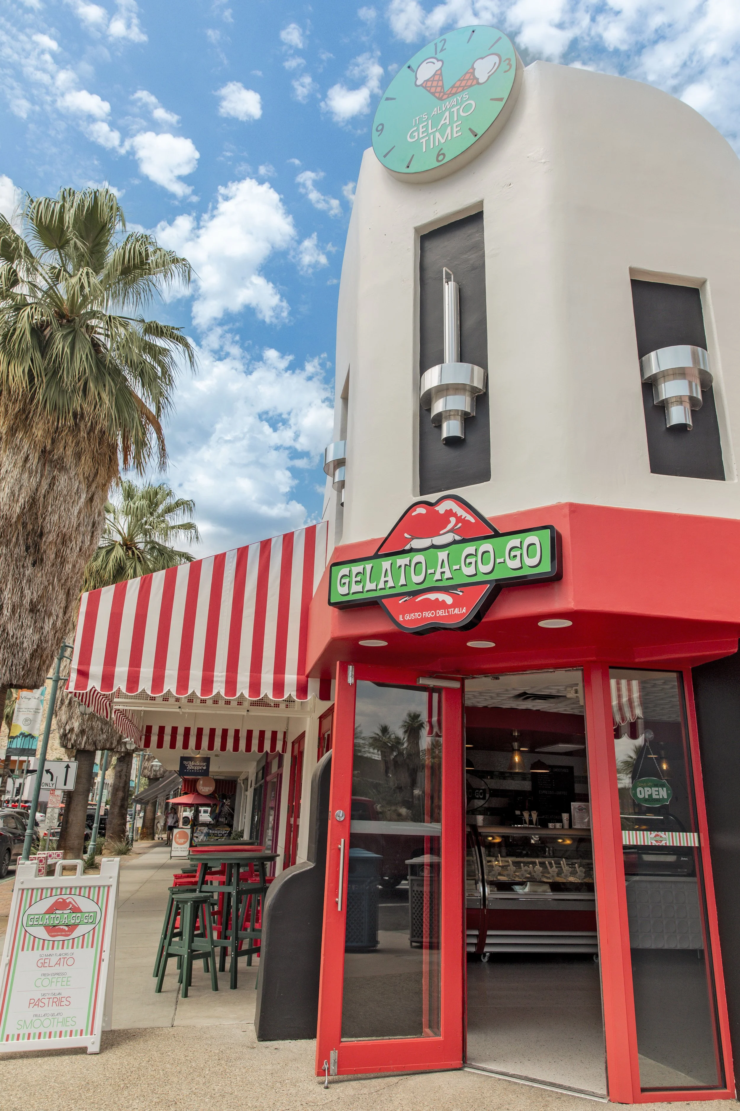 Located on a prominent corner in downtown Palm Springs, Gelato-A-Go-Go is impossible to miss. This 1950s deco-style beauty of a building now flaunts our big, sassy lips above the door, our “It’s Always Gelato Time” clock at the top, and those eye-catching red-and-white striped retro awnings that throw just enough shade - on the sidewalk, not your outfit, bella!