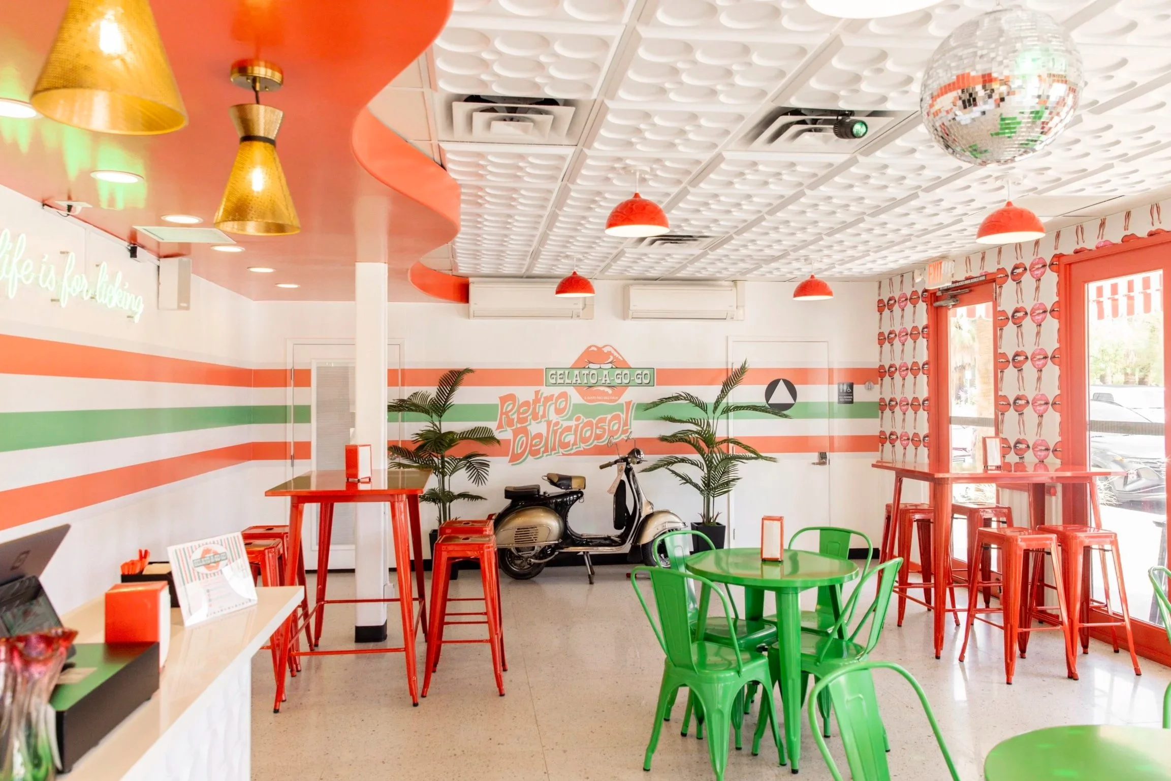 With bright and bold colored tables both inside and out, we’ve got you, whether you're up for a quick lick in, a late-night sweet treat outside, or something groovy to go.