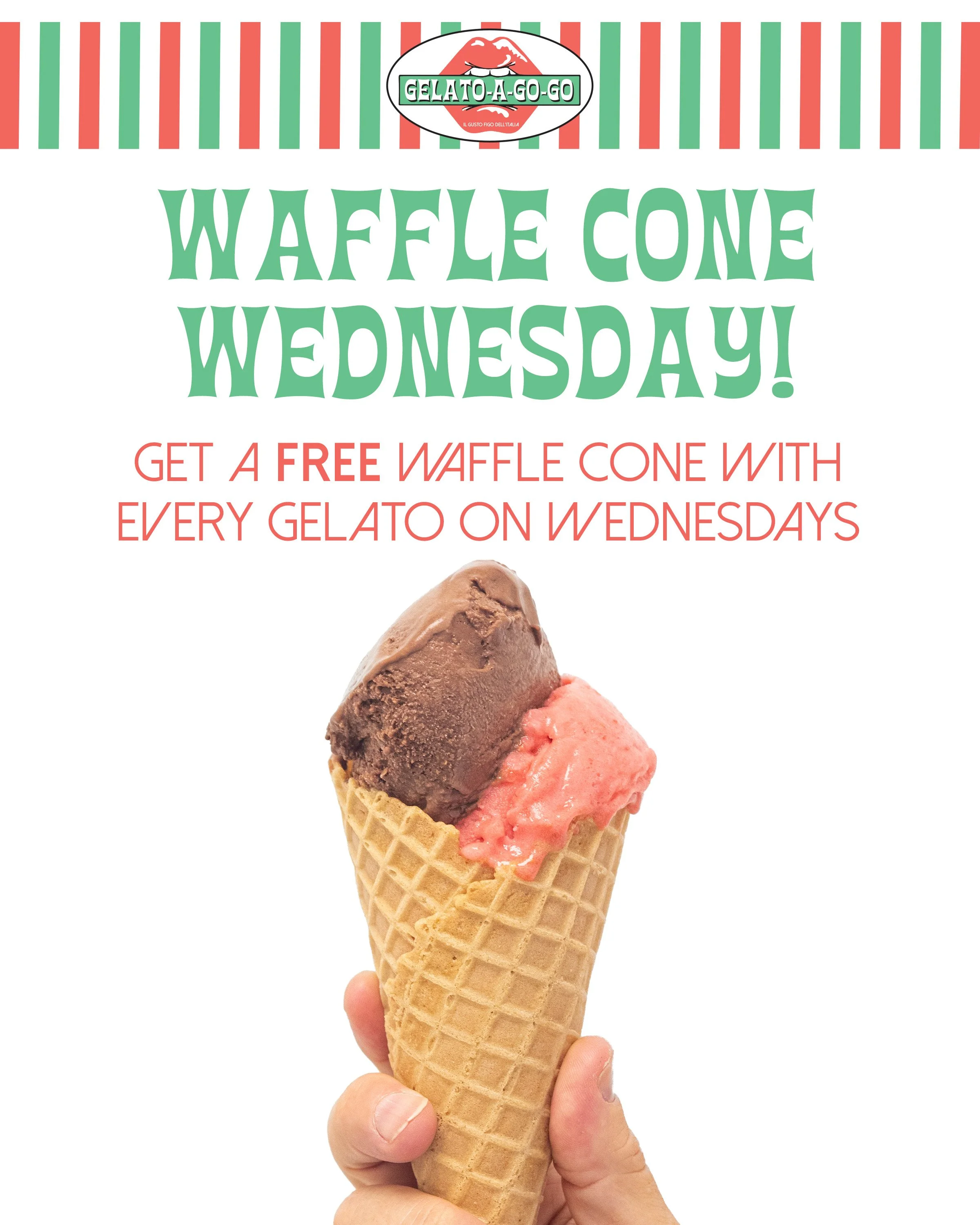 Get over that midweek hump because Waffle Cone Wednesday means you get a FREE Waffle Cone with every gelato purchase on Wednesdays.