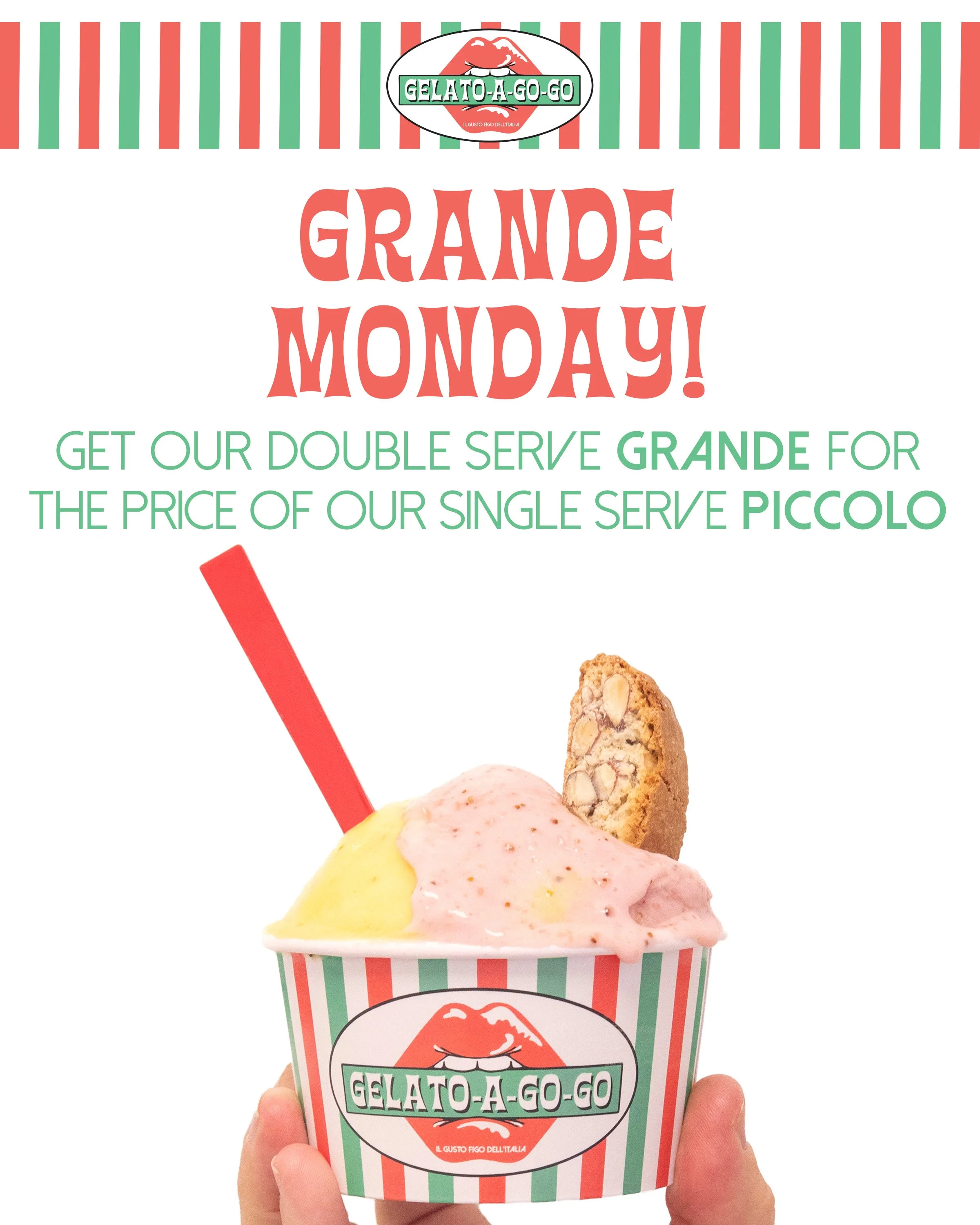 Start the work week off with a win and get a “Grande” size double serve for the price of a Piccolo single at Gelato-A-Go-Go every Monday.